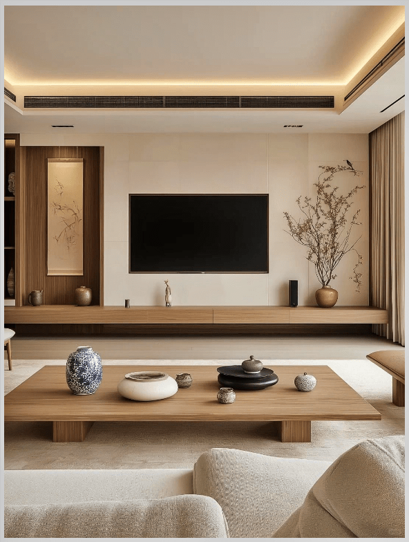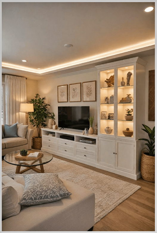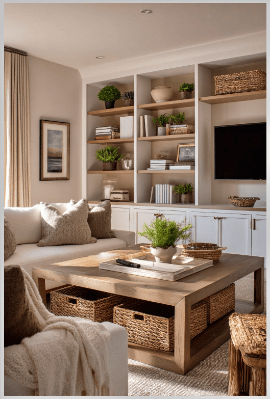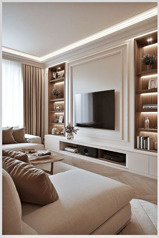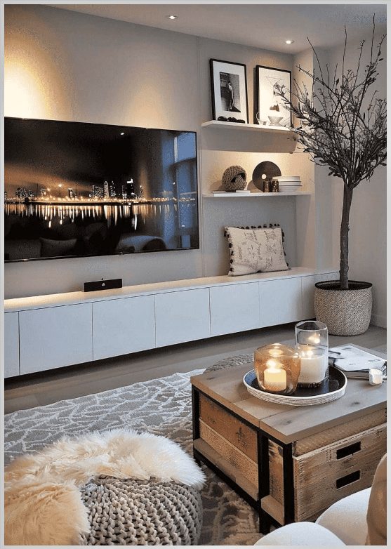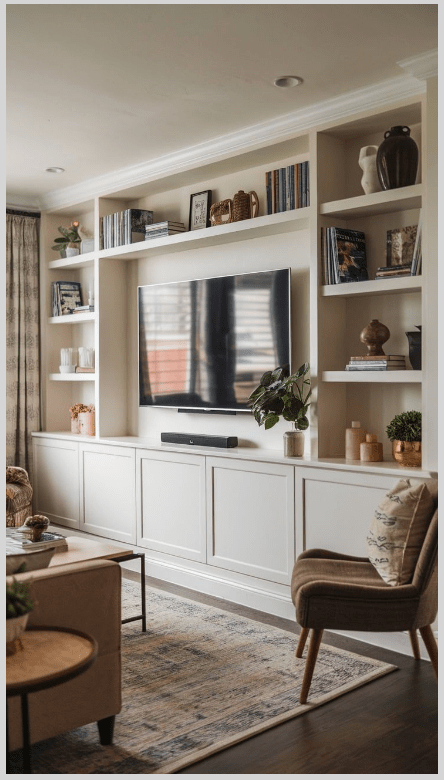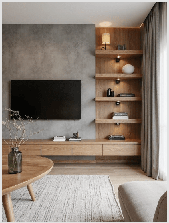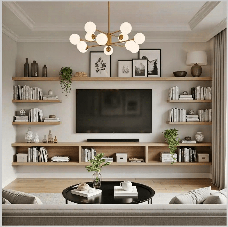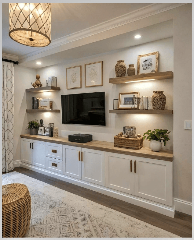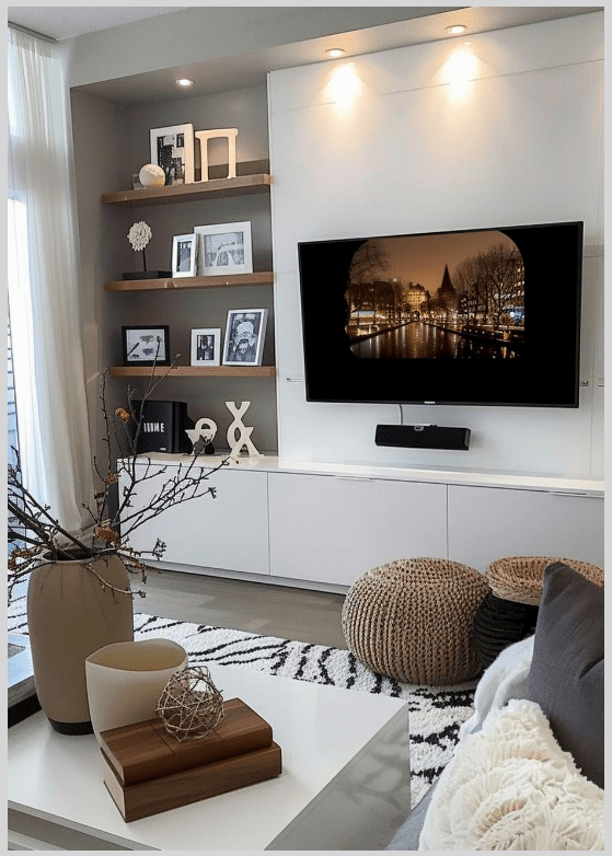 Αυτή η εικόνα αποπνέει μια αίσθηση ηρεμίας και καθαρότητας, σαν να μπαίνεις σε ένα σπίτι που σε υποδέχεται χωρίς προσπάθεια. Το καθιστικό είναι φωτεινό, ανάλαφρο και απόλυτα ισορροπημένο. Η τηλεόραση τοποθετημένη στο κέντρο του τοίχου «δένει» όμορφα με το λευκό έπιπλο βάσης και τον ξύλινο πάγκο, που προσθέτει ζεστασιά και φυσικότητα στον χώρο.Τα επιτοίχια ράφια δεξιά και αριστερά δημιουργούν συμμετρία και δίνουν χαρακτήρα χωρίς να βαραίνουν. Πάνω τους βλέπουμε φυτά, ψάθινα καλάθια, κεραμικά και βιβλία — όλα επιλεγμένα με τρόπο που δείχνει χαλαρός αλλά πολύ προσεγμένος. Είναι αυτές οι λεπτομέρειες που κάνουν τον χώρο να μοιάζει ζωντανός και προσωπικός, όχι «στημένος».