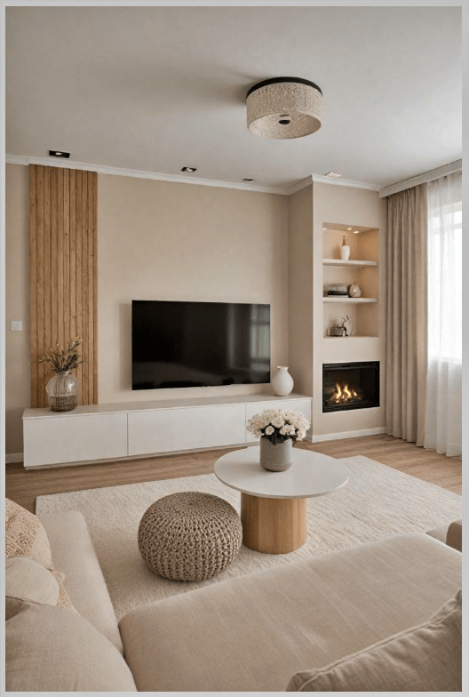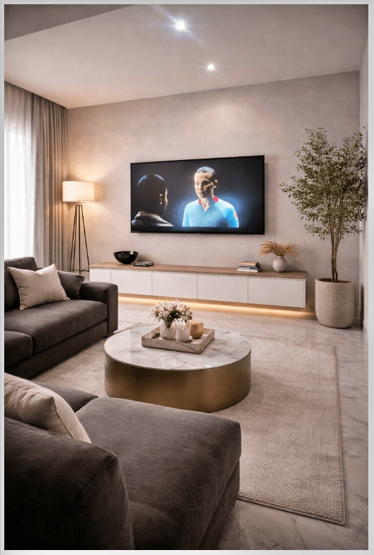 Το φυτό στη γωνία δίνει ζωή και μια φυσική ανάσα στον χώρο, ενώ οι κουρτίνες σε ουδέτερους τόνους ολοκληρώνουν την αίσθηση ηρεμίας.Για εμένα, αυτός είναι ο σωστός τρόπος να τοποθετείται η τηλεόραση στο σαλόνι: μέσα σε μια σύνθεση που έχει ταυτότητα, ζεστασιά και ισορροπία. Ένας χώρος λειτουργικός αλλά και αισθητικά ολοκληρωμένος, που αντικατοπτρίζει τον άνθρωπο που τον ζει.