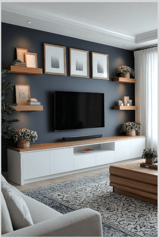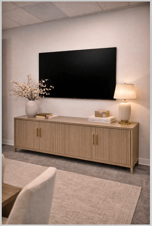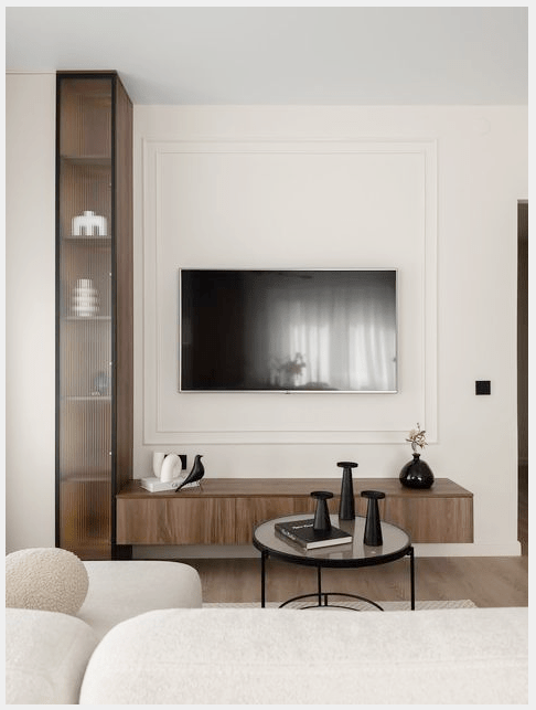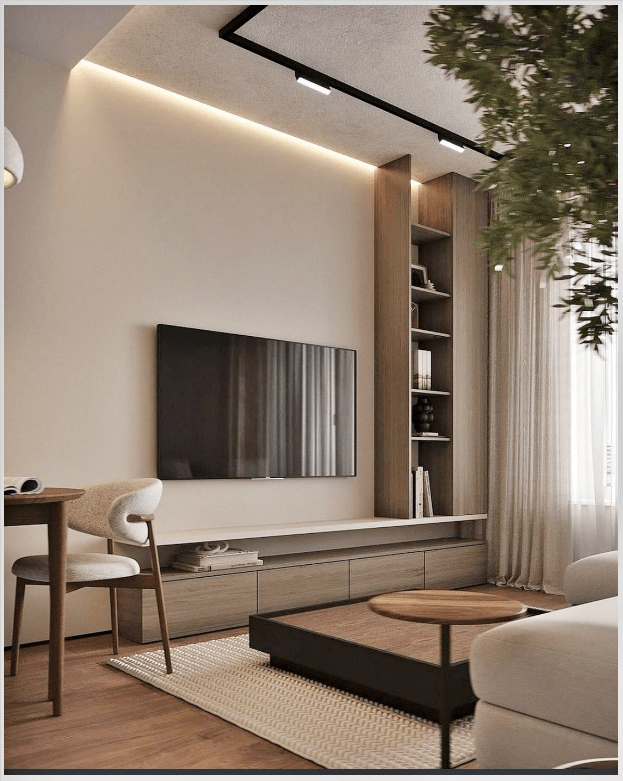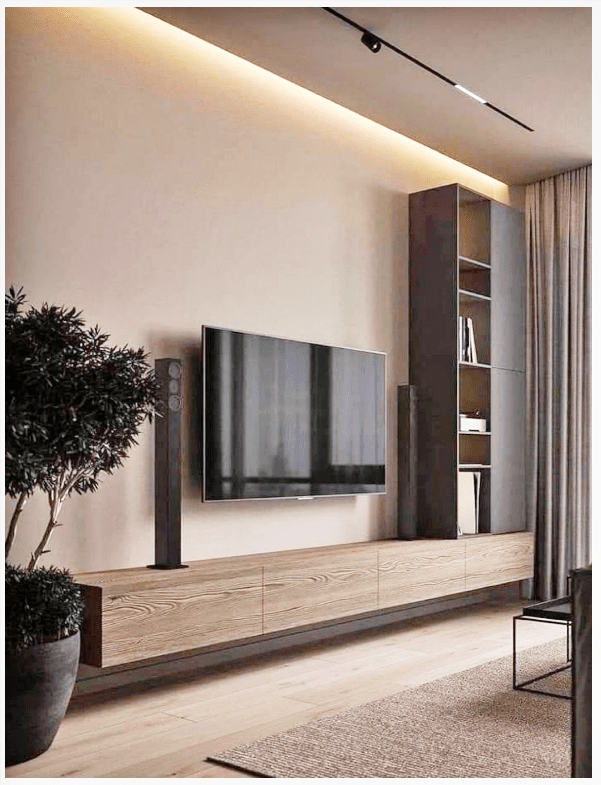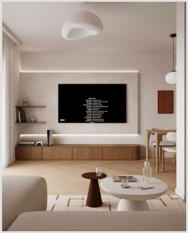 Η εικόνα αποπνέει μια ήρεμη, σύγχρονη ζεστασιά. Ένα καθιστικό καθαρό και ισορροπημένο, όπου τίποτα δεν είναι περιττό. Η τηλεόραση είναι τοποθετημένη διακριτικά στον τοίχο και «δένει» απόλυτα με το χαμηλό ξύλινο έπιπλο, που απλώνεται οριζόντια και δίνει αίσθηση ηρεμίας και τάξης. Το φυσικό ξύλο ζεσταίνει τον χώρο και ισορροπεί όμορφα με τις σκούρες, ματ επιφάνειες της σύνθεσης.
