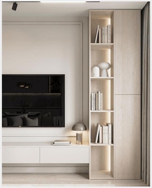 Η ψηλή στήλη με τα ράφια λειτουργεί σαν ήρεμο πλαίσιο, φιλοξενώντας βιβλία και αντικείμενα χωρίς να βαραίνει το σύνολο. Ο κρυφός φωτισμός στην οροφή προσθέτει βάθος και ατμόσφαιρα, αγκαλιάζοντας τον τοίχο με ένα απαλό, ζεστό φως.