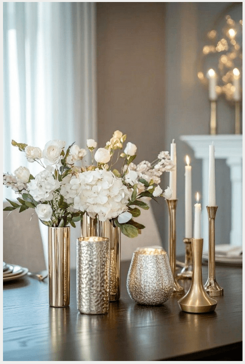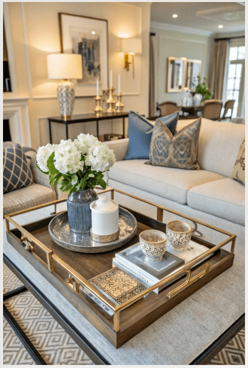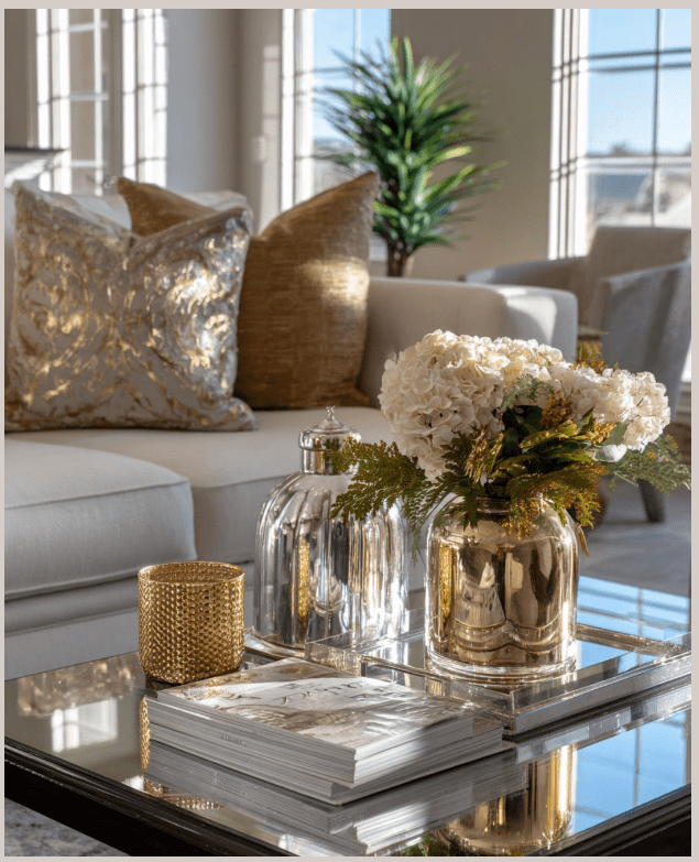 Τα χρυσά διακοσμητικά στο τραπεζάκι σαλονιού, όπως βάζα και κηροπήγια, προσθέτουν μια αίσθηση κομψότητας και διακριτικής πολυτέλειας στον χώρο. Δεν χρειάζονται πολλά· λίγα, σωστά επιλεγμένα κομμάτια αρκούν για να φωτίσουν το σαλόνι και να τραβήξουν το βλέμμα με τον πιο ήρεμο τρόπο.