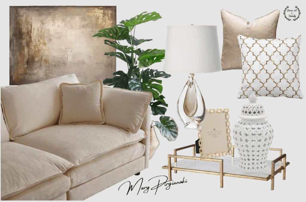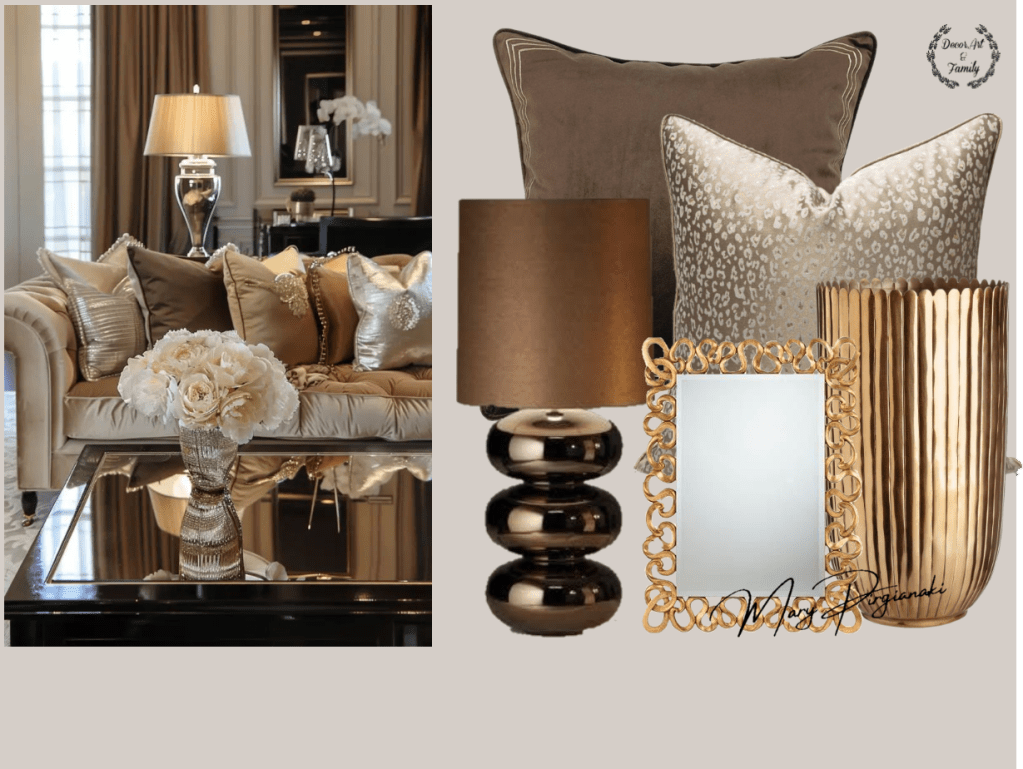 Τα διακοσμητικά στοιχεία ολοκληρώνουν την εικόνα. Καθρέφτες με χρυσές κορνίζες, κεραμικά ή μεταλλικά αντικείμενα και μικρές λάμψεις σε προσεγμένα σημεία προσθέτουν αυτή τη διακριτική πολυτέλεια που δεν κουράζει, αλλά γοητεύει.