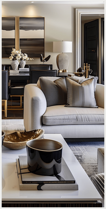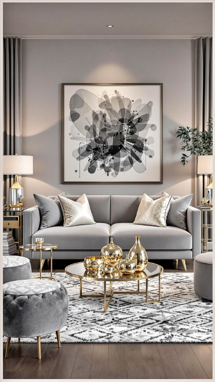 Η πολυτέλεια μπορεί να είναι και πιο σύγχρονη, πιο ήρεμη. Το γκρι σε συνδυασμό με λαμπερό ασημί δημιουργεί ένα σαλόνι κομψό, καθαρό και διαχρονικό. Τα έπιπλα εδώ έχουν πιο αυστηρές γραμμές, αλλά πάντα με έμφαση στην ποιότητα και την άνεση.