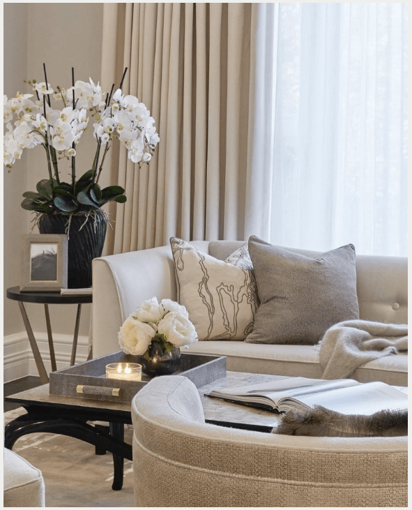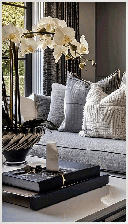 Τα υφάσματα στους καναπέδες και τα μαξιλάρια παίζουν με τις υφές: ματ και γυαλιστερά, απαλά και δομημένα. Αυτή η αντίθεση δίνει βάθος και ενδιαφέρον στον χώρο. Οι κουρτίνες σε γκρι αποχρώσεις, με ελαφριά λάμψη, φιλτράρουν το φως και δημιουργούν μια ήρεμη, κομψή ατμόσφαιρα.