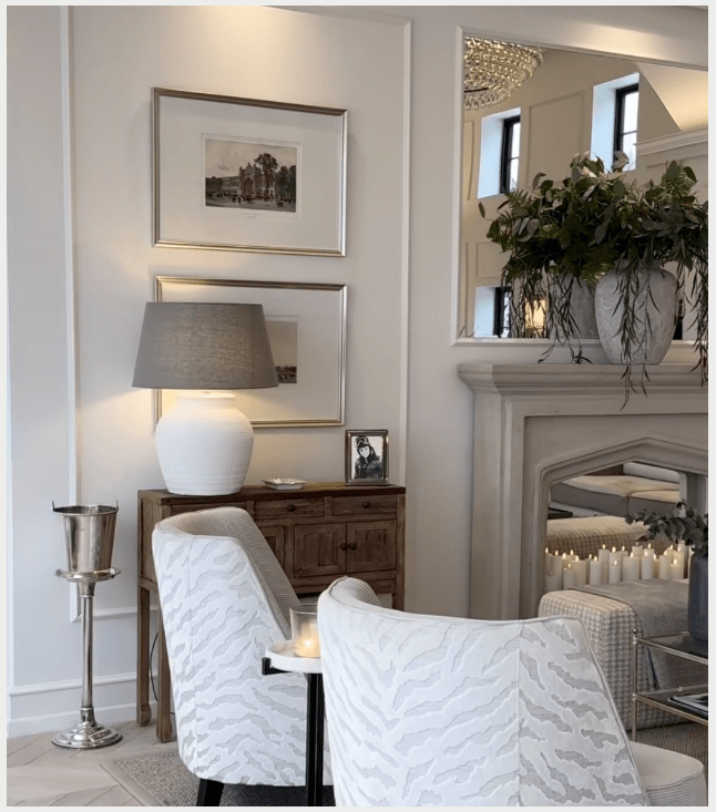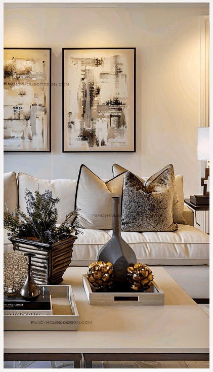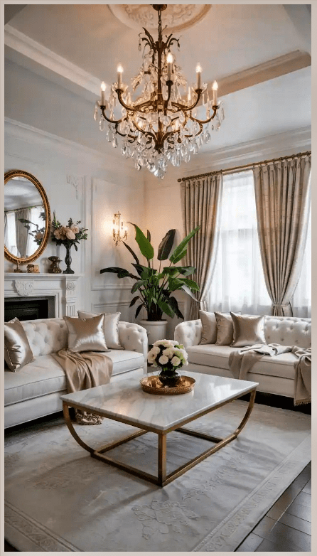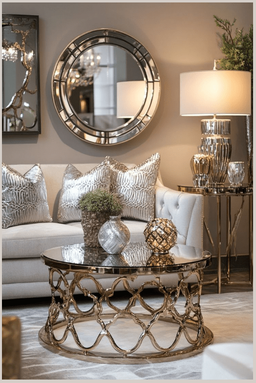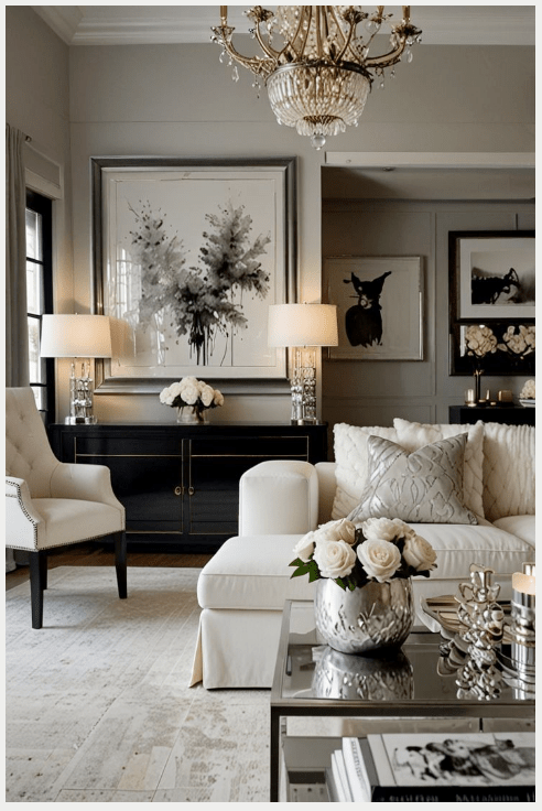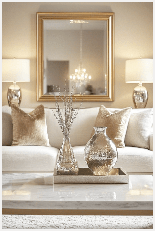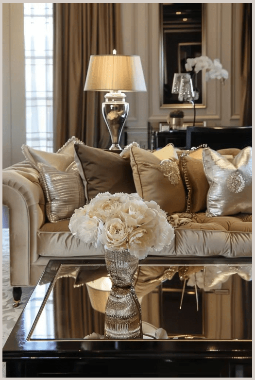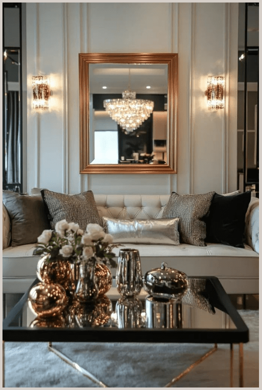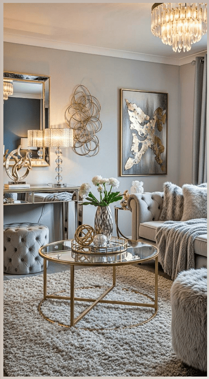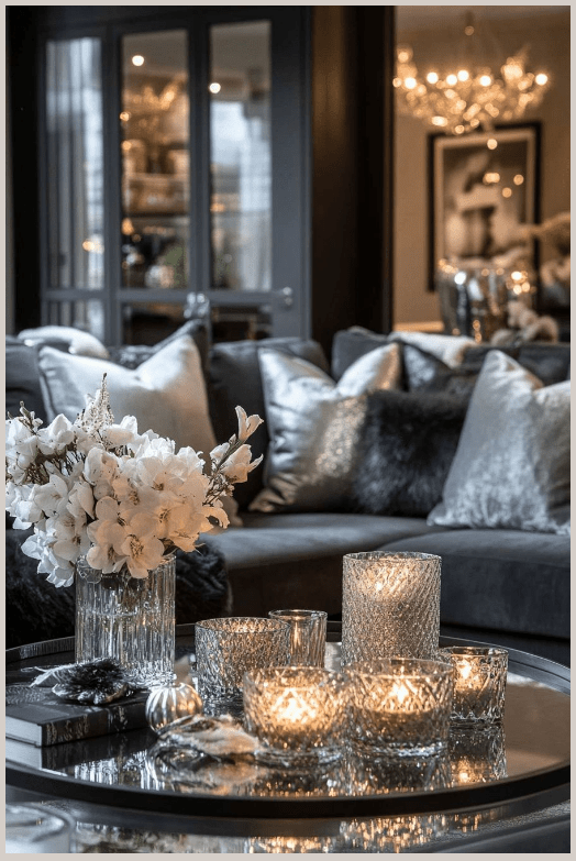 Τα φωτιστικά με ασημί λεπτομέρειες και οι γυάλινες επιφάνειες αντανακλούν το φως και κάνουν το σαλόνι να δείχνει πιο φωτεινό και ανοιχτό. Τα πολυτελή διακοσμητικά, λιγότερα αλλά πιο ουσιαστικά, ολοκληρώνουν τον χώρο χωρίς υπερβολές.