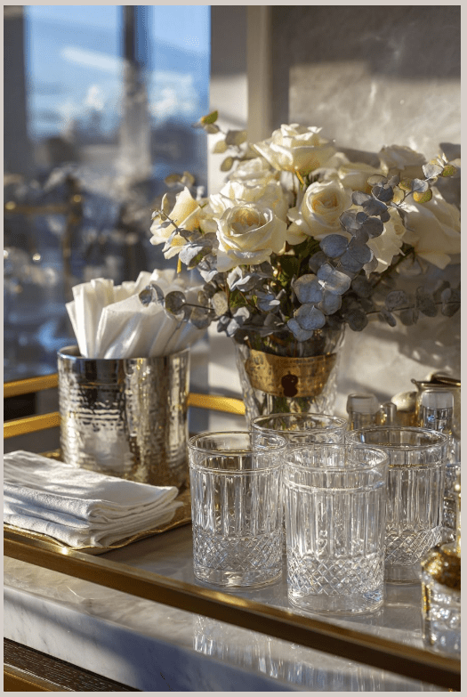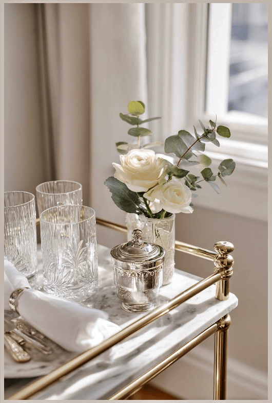 Σε ένα τραπεζάκι με ποτά, το κρύσταλλο και το ασημένιο στοιχείο δημιουργούν μια εικόνα κομψή και απόλυτα εκλεπτυσμένη. Τα κρυστάλλινα ποτήρια, με τις λεπτομέρειες και τις αντανακλάσεις τους, δίνουν λάμψη και κάνουν ακόμη και την πιο απλή στιγμή να μοιάζει ξεχωριστή. Δίπλα τους, ένα κρυστάλλινο βάζο ή καράφα προσθέτει ισορροπία και πολυτέλεια χωρίς υπερβολή.