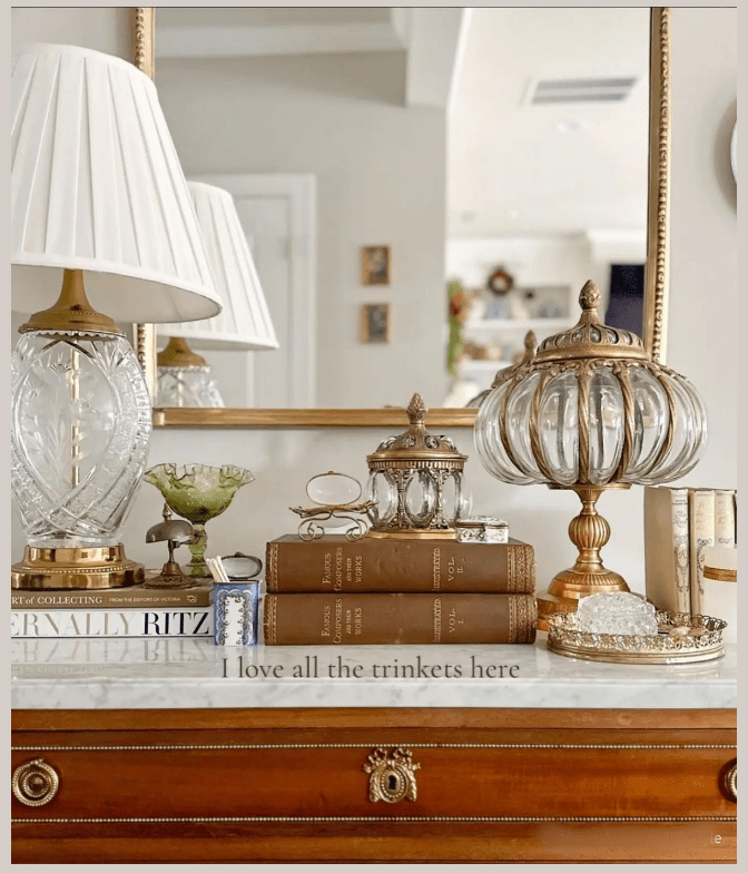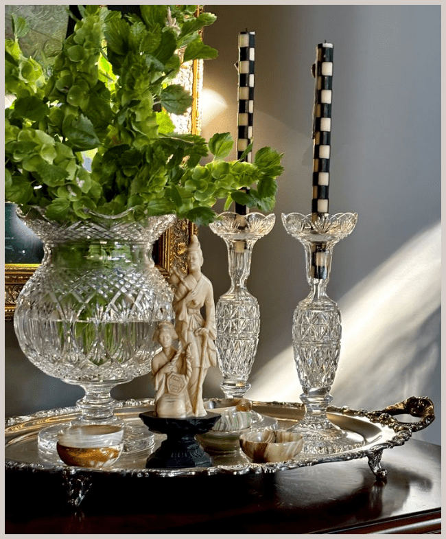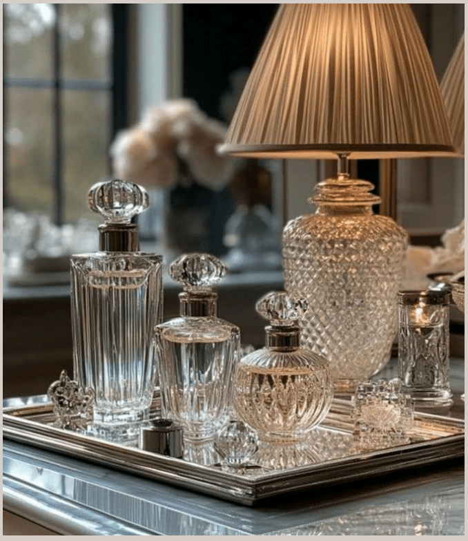 Μικρά κρυστάλλινα στοιχεία τοποθετημένα σε έναν δίσκο πάνω στην κονσόλα δημιουργούν μια εικόνα κομψή και απόλυτα ισορροπημένη. Η λάμψη του κρυστάλλου αντανακλά το φως διακριτικά, προσθέτοντας βάθος και φινέτσα χωρίς υπερβολή. Είναι μια σύνθεση λιτή αλλά πολύ προσεγμένη, που αναδεικνύει την κονσόλα και δίνει στον χώρο αίσθηση διαχρονικής κομψότητας και φροντίδας.