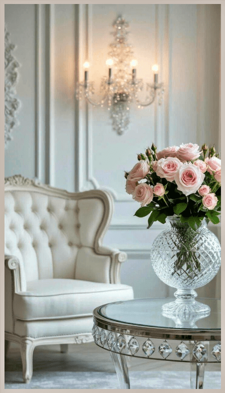 Στη διακόσμηση με κρύσταλλο πιστεύω πολύ στο μέτρο. Λίγα, σωστά τοποθετημένα κομμάτια έχουν μεγαλύτερη αξία από πολλά. Ένας δίσκος με κρυστάλλινα βαζάκια, ένα εντυπωσιακό βάζο ή δύο κηροπήγια αρκούν για να αναδείξουν το σαλόνι και να του δώσουν χαρακτήρα.