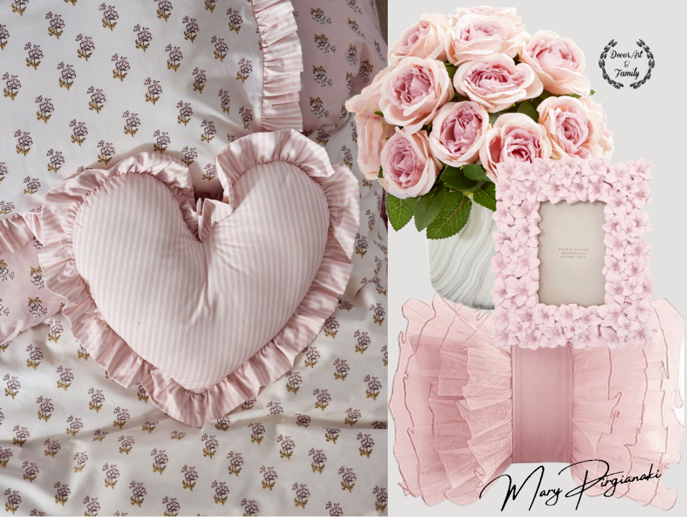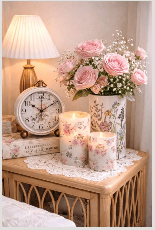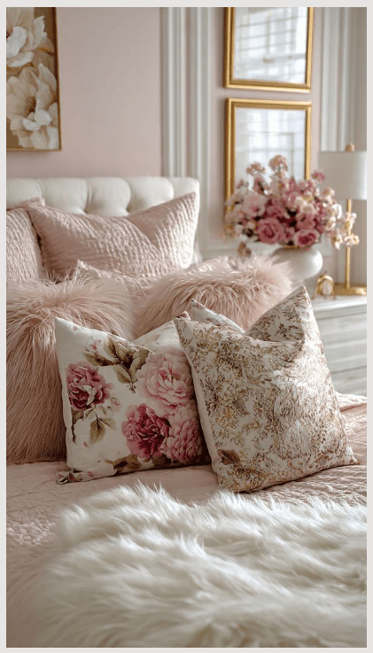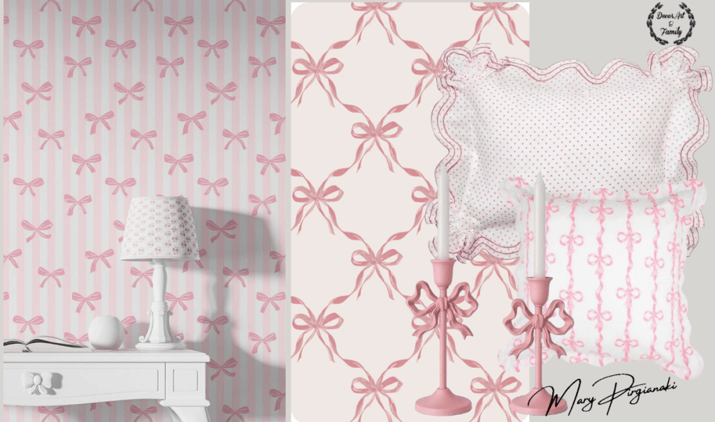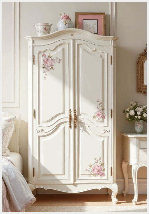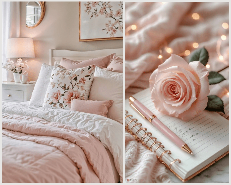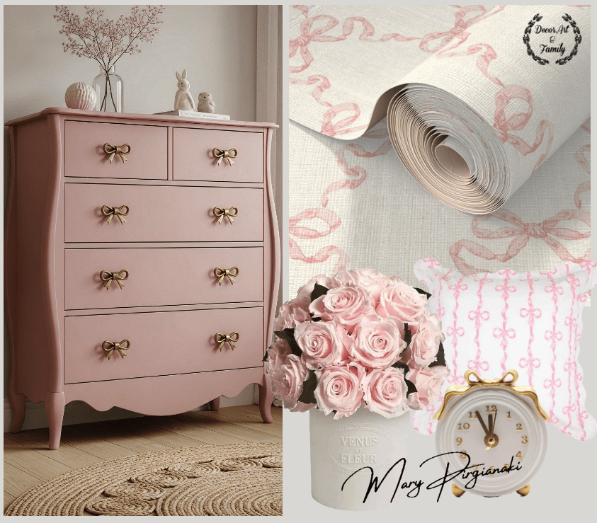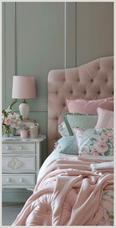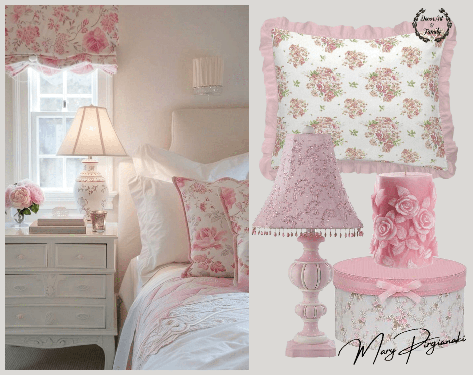 Μπορείς να παίξεις με λεπτομέρειες: ροζ κορνίζες με πατίνα, λευκά έπιπλα με ελαφρύ “φθαρμένο” φινίρισμα, ακόμα και ένα vintage κομοδίνο σε παστέλ τόνο.