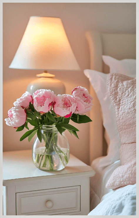 Το shabby chic δεν περιορίζεται στα υφάσματα. Τα φρέσκα λουλούδια σε βάζα είναι βασικό στοιχείο. Τριαντάφυλλα, παιώνιες, γυψοφίλη ή ακόμα και απλά αγριολούλουδα σε γυάλινα ή κεραμικά βάζα δίνουν ζωή και κίνηση στον χώρο.