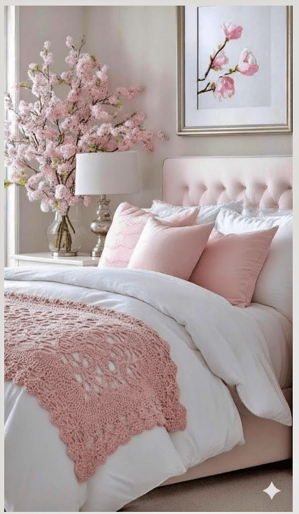 Τα υφάσματα καλό είναι να είναι βαμβακερά ή λινά, ώστε να ενισχύουν την αίσθηση δροσιάς. Το layering (στρώσεις υφασμάτων) δίνει πλούτο χωρίς να βαραίνει το αποτέλεσμα — ένα πάπλωμα με ροζ floral μοτίβο, λευκά σεντόνια και 2-3 μαξιλάρια σε διαφορετικές παστέλ αποχρώσεις αρκούν για να μεταμορφώσουν το κρεβάτι σε ανοιξιάτικη αγκαλιά.