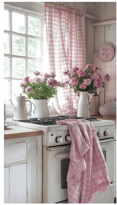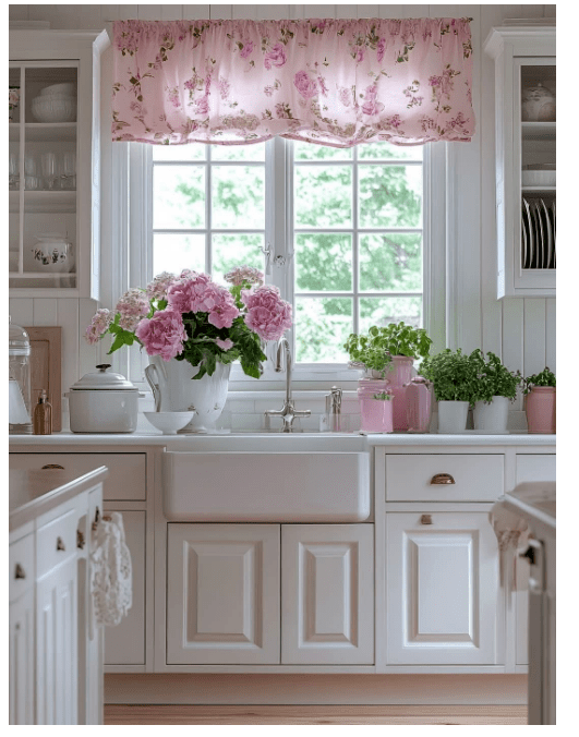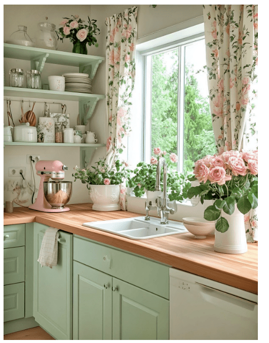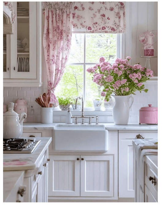 Μικρά ανθάκια σε παστέλ τόνους ή πιο ζωηρά μοτίβα με πράσινες λεπτομέρειες δίνουν χαρακτήρα χωρίς να βαραίνουν τον χώρο. Όταν το παράθυρο είναι ανοιχτό και οι κουρτίνες κινούνται ελαφρά, η κουζίνα αποκτά μια σχεδόν εξοχική ατμόσφαιρα.