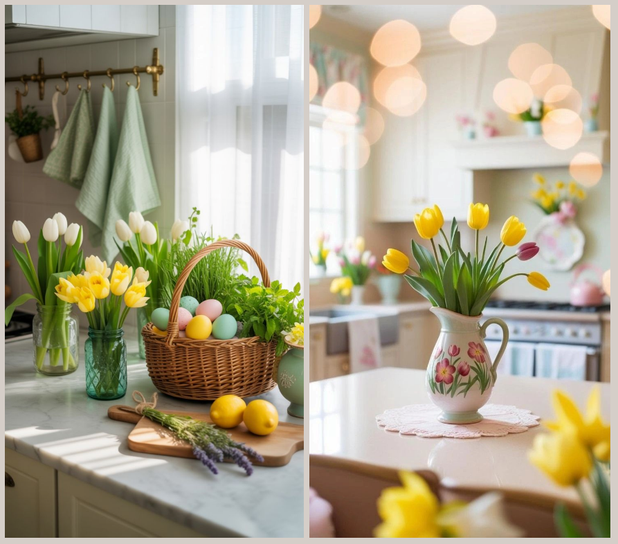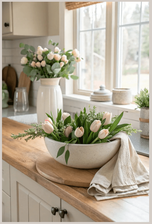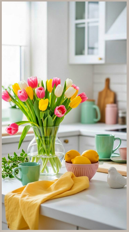 Τίποτα δεν φέρνει την άνοιξη πιο γρήγορα στην κουζίνα από ένα βάζο με φρέσκα λουλούδια. Τουλίπες, μαργαρίτες, πασχαλιές ή παιώνιες τοποθετημένες σε γυάλινα ή κεραμικά βάζα δίνουν ζωντάνια και φυσική ομορφιά.