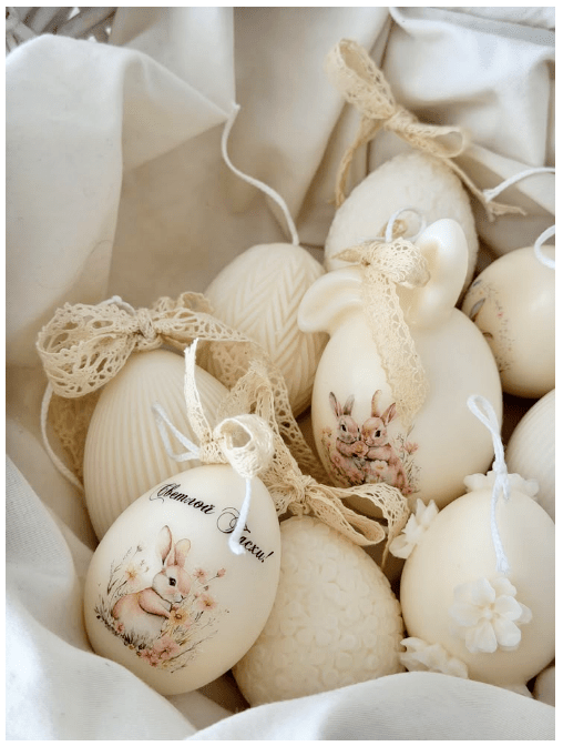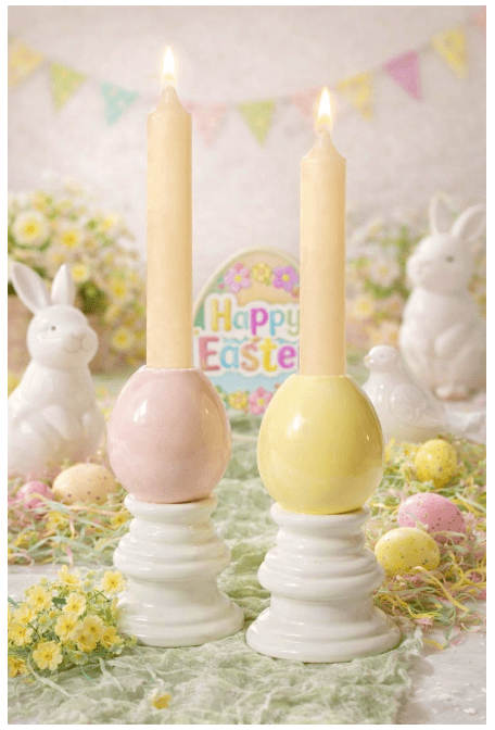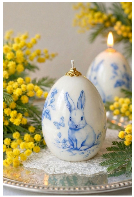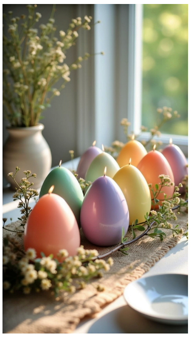 Μπορείς να επιλέξεις κεράκια σε παστέλ αποχρώσεις — λιλά, ροζ, σιέλ ή απαλό κίτρινο — που δίνουν μια ήρεμη και κομψή αίσθηση στον χώρο σου. Το σχήμα του αυγού από μόνο του συμβολίζει το Πάσχα, οπότε δεν χρειάζονται πολλά για να δείχνει όμορφο.