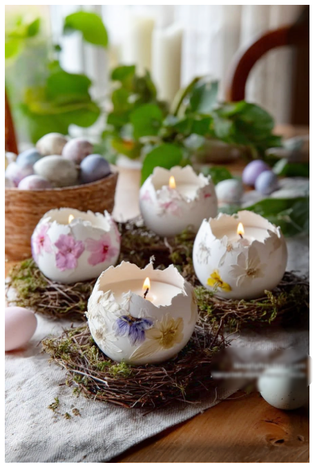 Αν όμως θέλεις κάτι πιο ιδιαίτερο, δοκίμασε να φτιάξεις κεράκια μέσα σε φυσικό κέλυφος αυγού. Καθάρισε προσεκτικά το αυγό, γέμισέ το με κερί και άφησέ το να σταθεροποιηθεί. Έτσι δημιουργείς ένα μικρό, μοναδικό διακοσμητικό. Για να το απογειώσεις, στόλισέ το με μικρά λουλουδάκια — φρέσκα ή αποξηραμένα — γύρω από το κέλυφος ή στη βάση του. Μπορείς να προσθέσεις και λίγη πρασινάδα για πιο φυσικό αποτέλεσμα.