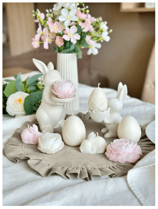 Φυσικά, δεν γίνεται να λείπουν τα αγαπημένα πασχαλινά σχήματα. Αν έχεις καλούπια, δοκίμασε να φτιάξεις κεριά σε σχήμα από λαγουδάκια ή άλλα πασχαλινά σύμβολα. Είναι παιχνιδιάρικα, χαριτωμένα και δίνουν μια πιο χαρούμενη νότα στη διακόσμησή σου.