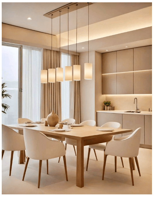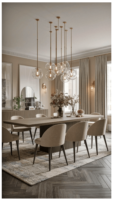 - Για μακριά τραπέζια, μπορείς να χρησιμοποιήσεις δύο ή περισσότερα φωτιστικά.