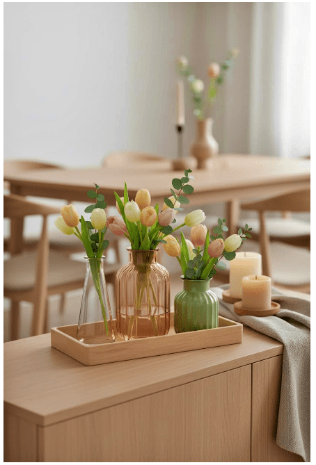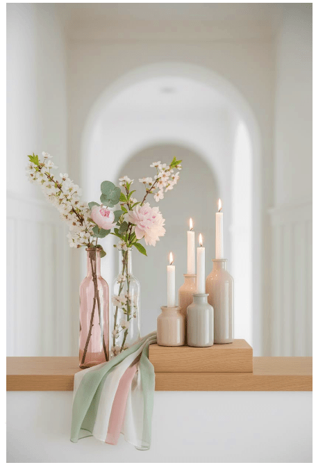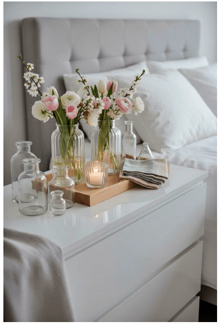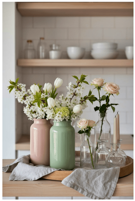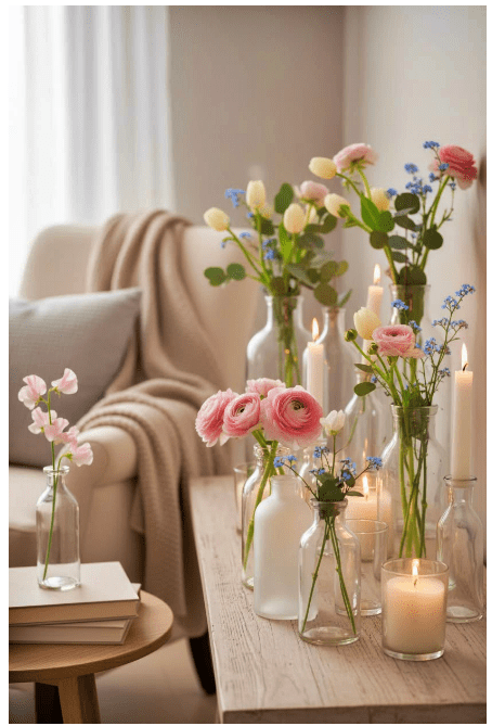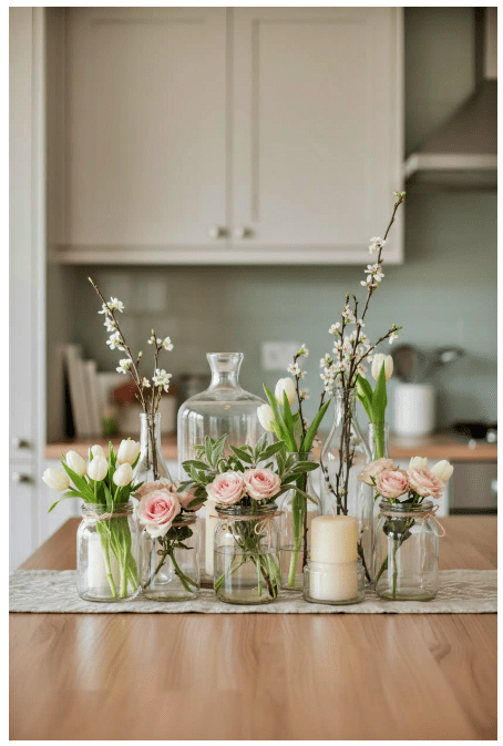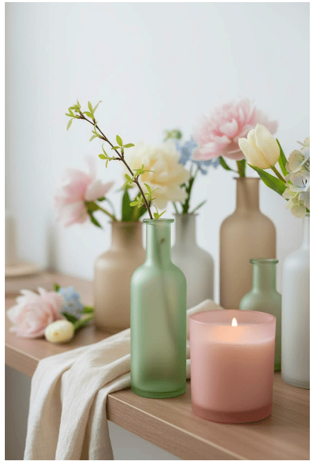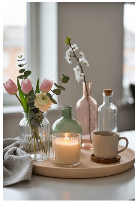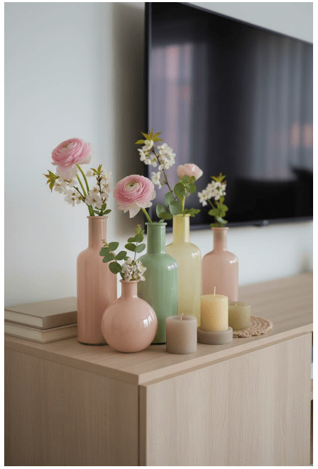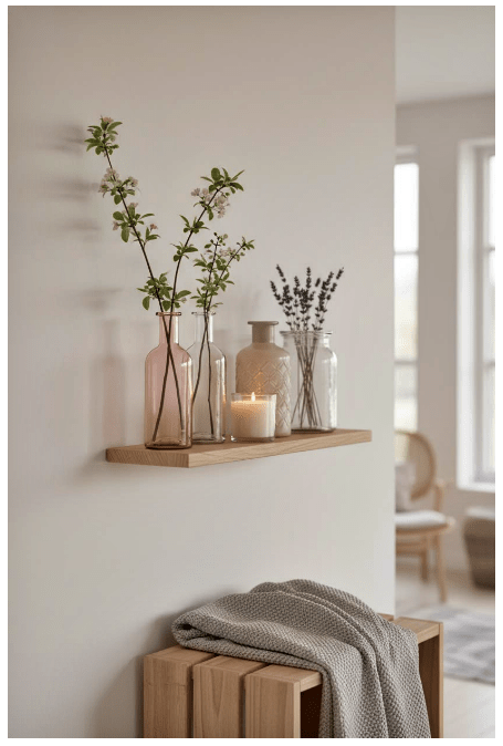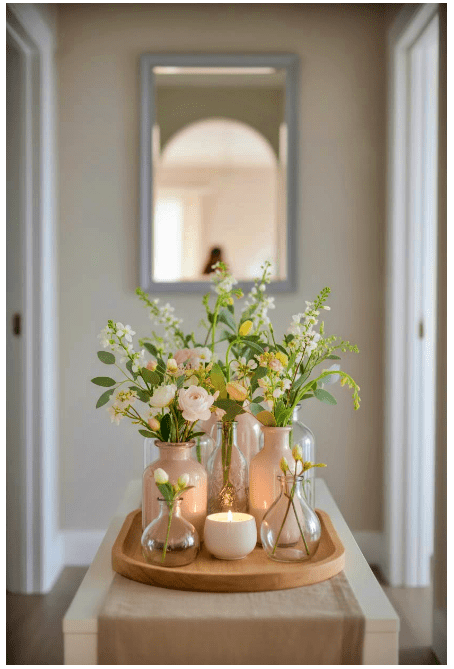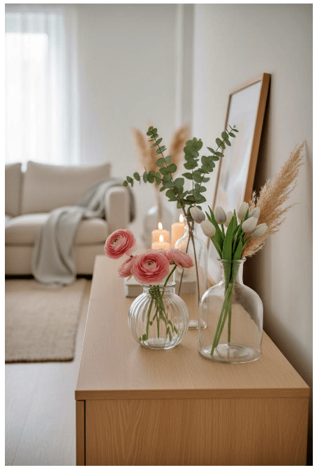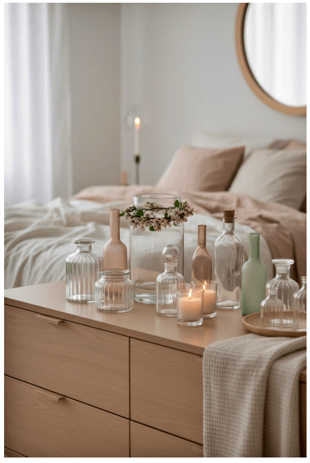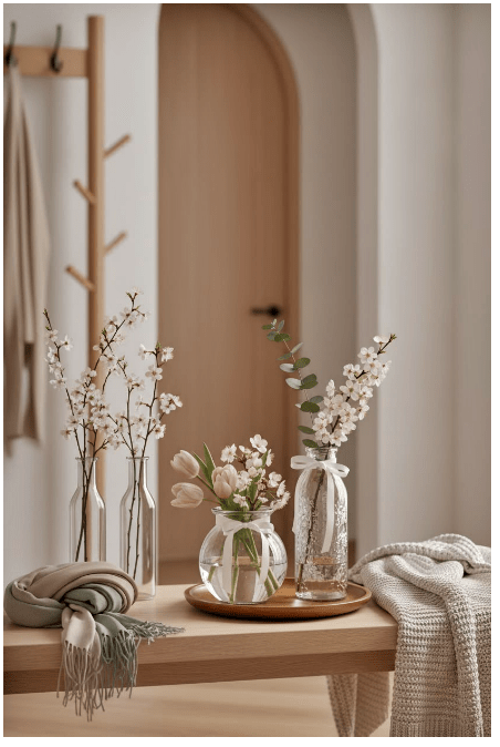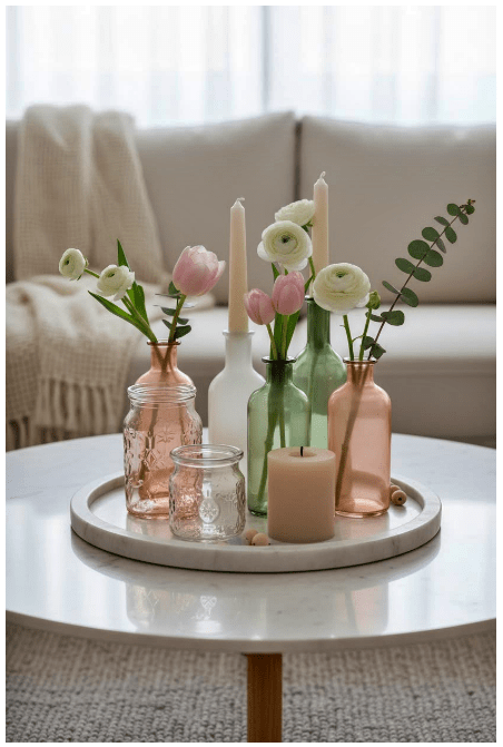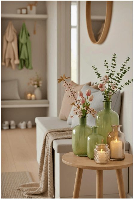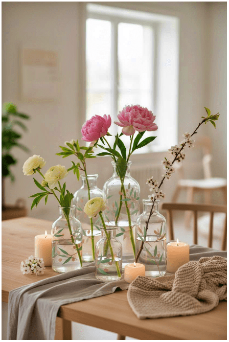 Μπορείς να τοποθετήσεις γυάλινα βάζα ή μπουκάλια σε διαφορετικά ύψη, είτε διάφανα είτε σε απαλές αποχρώσεις, για να δώσεις βάθος και ενδιαφέρον. Αν προσθέσεις και λίγα λουλούδια ή κλαδιά, το αποτέλεσμα γίνεται ακόμα πιο ζωντανό και φιλόξενο.