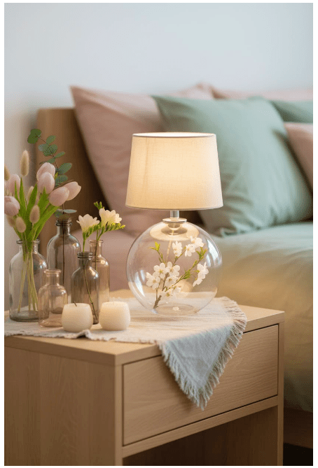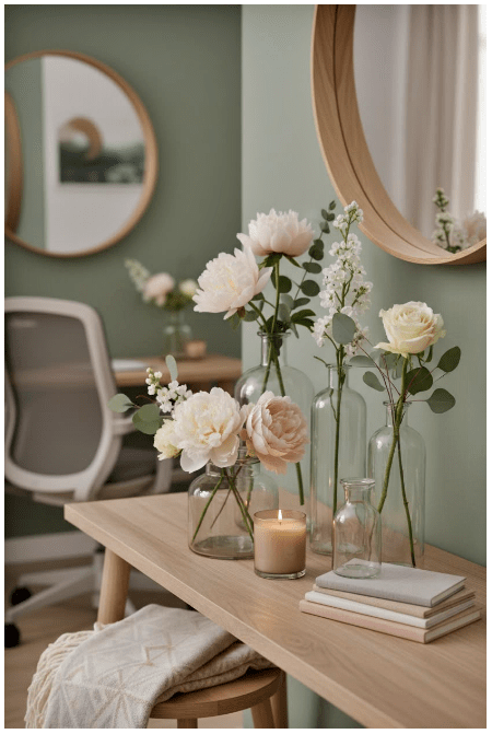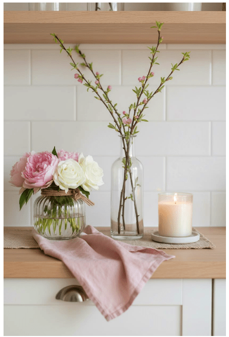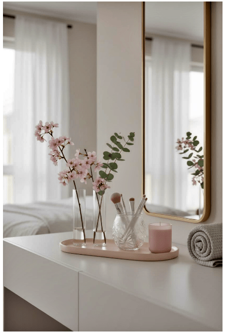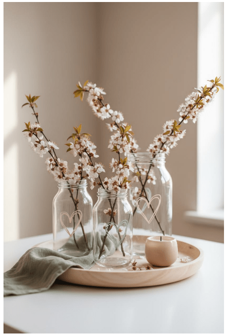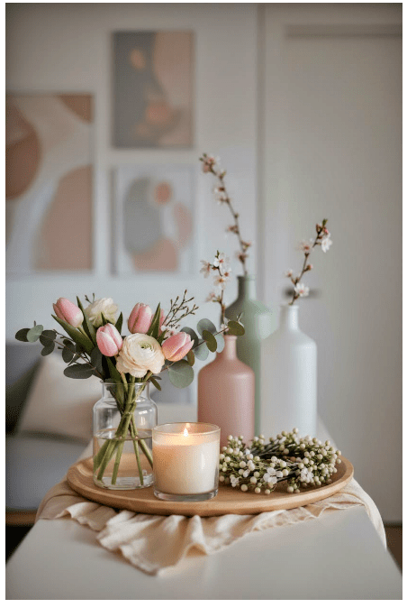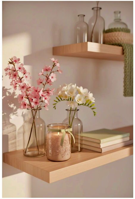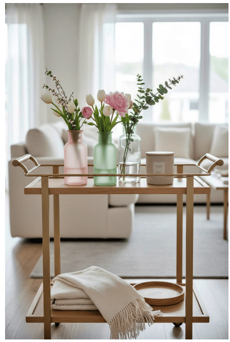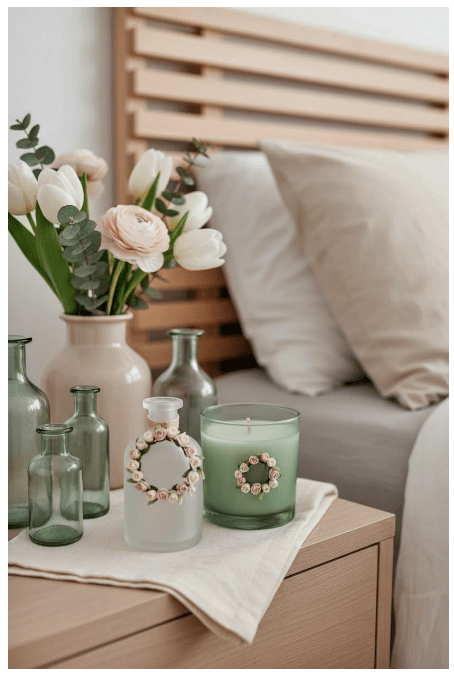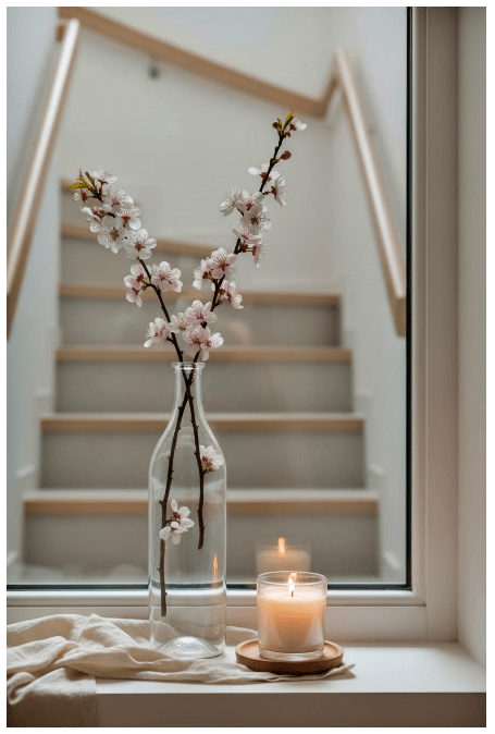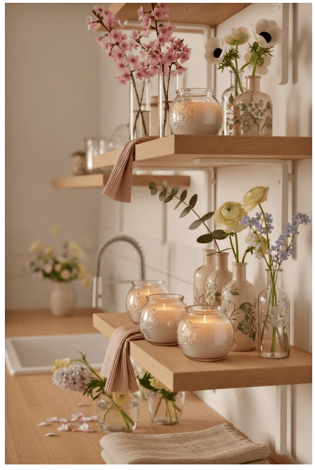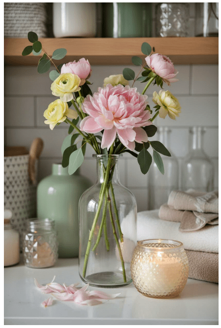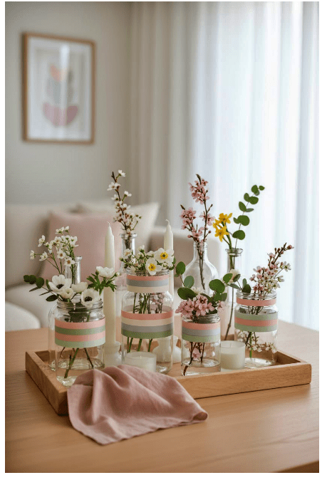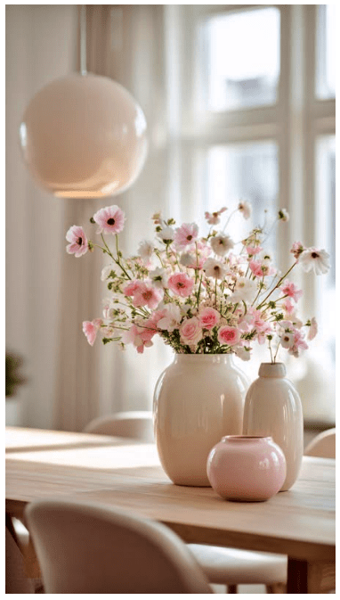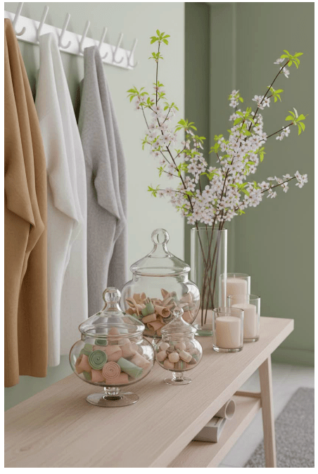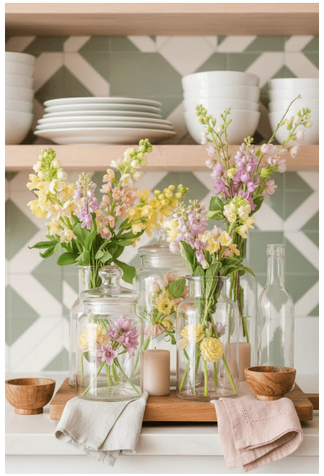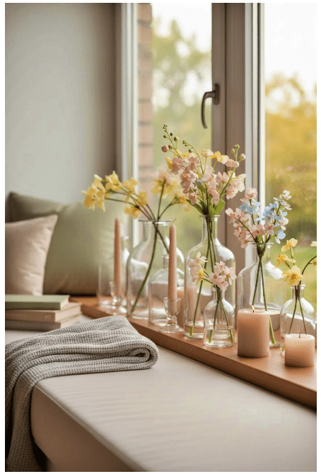 Μπορείς να τοποθετήσεις γυάλινα βάζα ή μπουκάλια σε διαφορετικά ύψη, είτε διάφανα είτε σε απαλές αποχρώσεις, για να δώσεις βάθος και ενδιαφέρον. Αν προσθέσεις και λίγα λουλούδια ή κλαδιά, το αποτέλεσμα γίνεται ακόμα πιο ζωντανό και φιλόξενο.