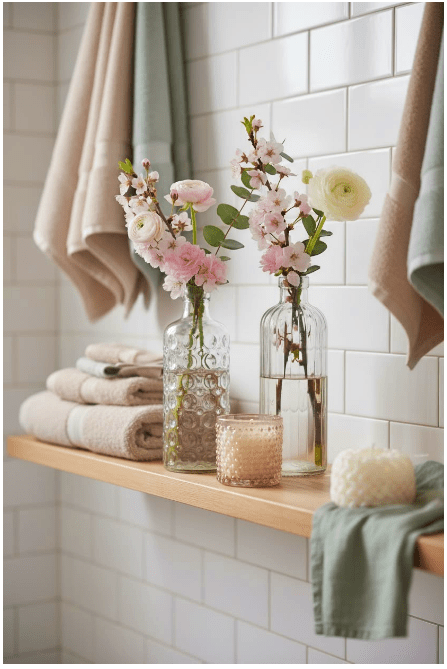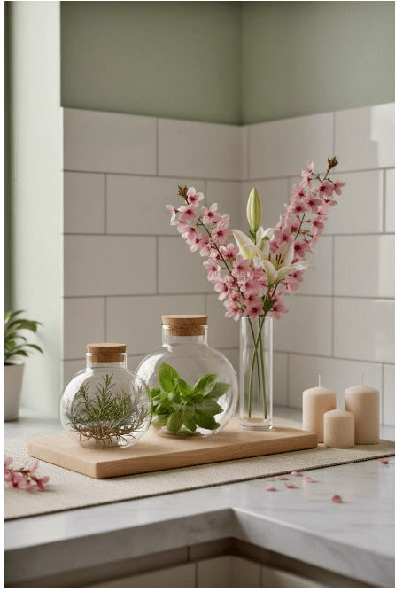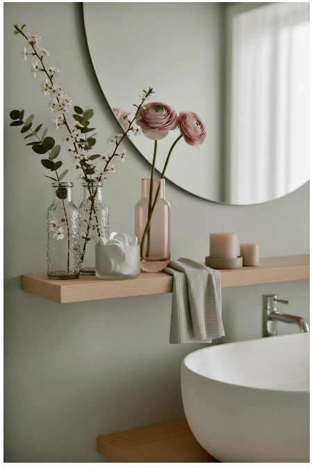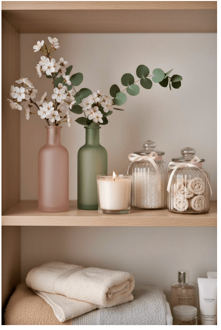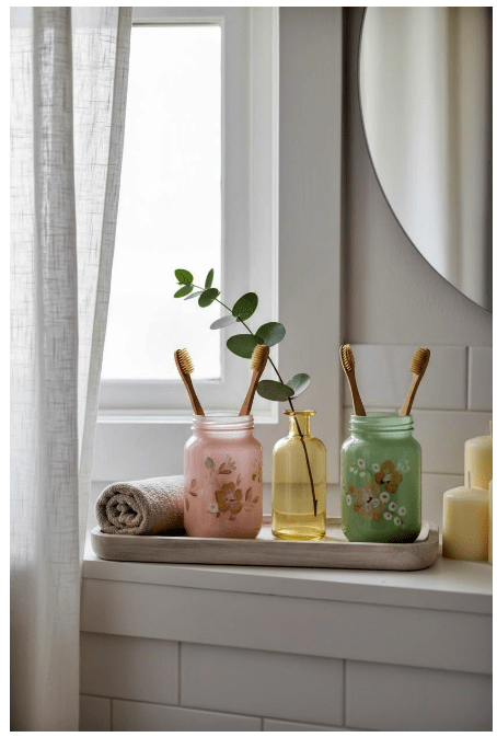 Τα γυάλινα στοιχεία στο μπάνιο σου προσθέτουν καθαρότητα και μια αίσθηση φρεσκάδας στον χώρο. Μπορείς να χρησιμοποιήσεις γυάλινα δοχεία για σαπούνι, βαμβάκι ή αρωματικά, δημιουργώντας μια κομψή και οργανωμένη εικόνα.