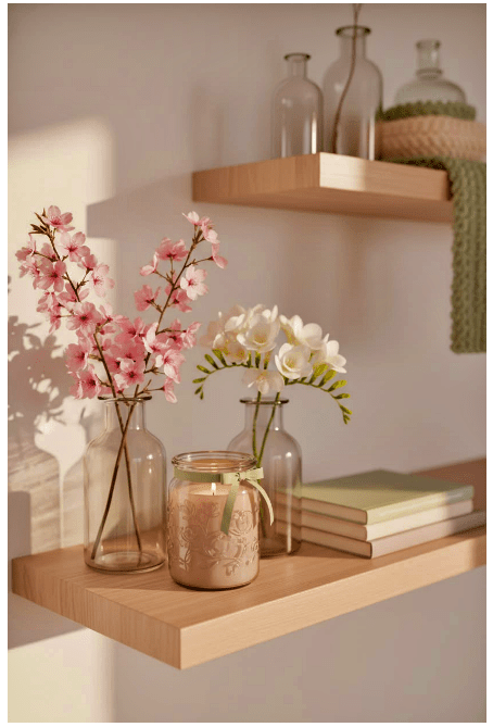 Στα ράφια τοίχου, τα γυάλινα αντικείμενα προσθέτουν ελαφρότητα και φωτεινότητα, χωρίς να βαραίνουν την εικόνα. Παίξε με διαφορετικά ύψη και σχήματα για να δημιουργήσεις μια προσεγμένη και αρμονική διακόσμηση.