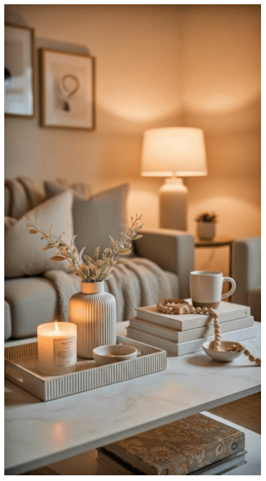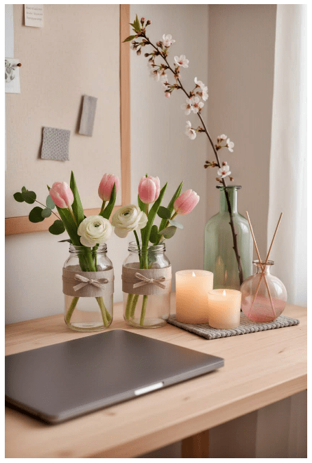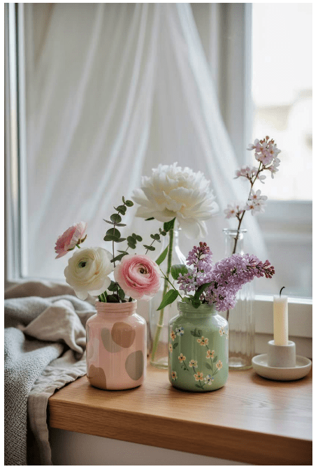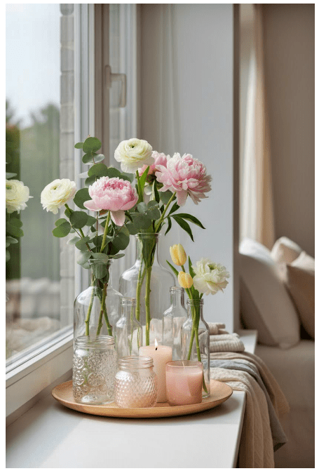 Μπορείς επίσης να αξιοποιήσεις γυάλινα διακοσμητικά, όπως βάζα ή μπουκάλια, προσθέτοντας μέσα λουλούδια, κοχύλια ή ακόμα και κεριά. Είναι μια απλή λεπτομέρεια που δίνει στυλ χωρίς κόστος.