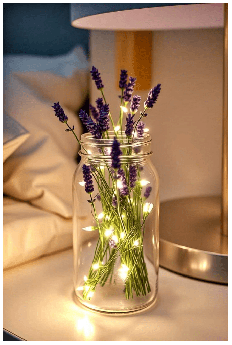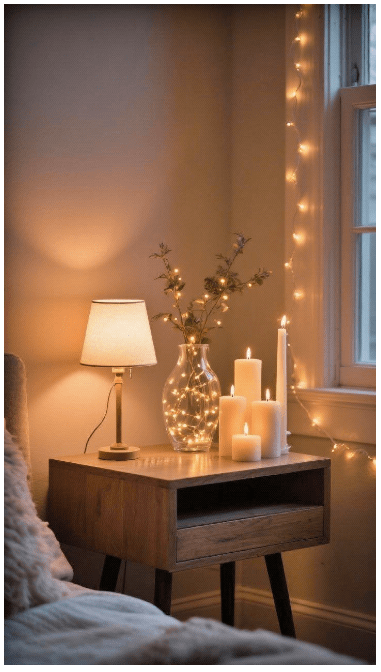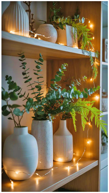 Μπορείς να προσθέσεις σε επιφάνειες επίπλων διακοσμητικές πινελιές με μικρά λαμπάκια, τα οποία προσφέρουν μια ζεστή και φιλόξενη ατμόσφαιρα στο χώρο σου. Αυτά τα φωτεινά στοιχεία μπορούν να τοποθετηθούν σε διάφορα σημεία, όπως σε ένα δεντράκι ή σε ένα γυάλινο βάζο, προσδίδοντας έτσι μια αίσθηση μαγείας και κομψότητας. Επιπλέον, μπορείς να χρησιμοποιήσεις τα λαμπάκια αυτά σε συνδυασμό με άλλες διακοσμητικές λεπτομέρειες, όπως κεριά ή μικρά φυτά, ώστε να δημιουργήσεις ένα μοναδικό αισθητικό αποτέλεσμα που θα τραβάει τα βλέμματα, όπως βλέπεις στην εικόνα δεξιά.