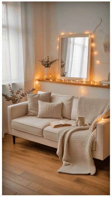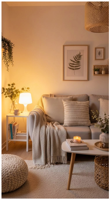 Μην ξεχνάς τον φωτισμό. Μικρά λαμπάκια ή φαναράκια μπορούν να αλλάξουν εντελώς την αίσθηση του χώρου σου, ειδικά τις βραδινές ώρες. Δώσε σημασία και στον φωτισμό. Μικρά φωτιστικά, λαμπάκια ή κεριά δημιουργούν μια ζεστή και χαλαρωτική ατμόσφαιρα τις βραδινές ώρες, που σε προσκαλεί να απολαύσεις τις ευχάριστες στιγμές της ημέρας που έχουν περάσει. Μπορείς να τοποθετήσεις τα φωτιστικά σε στρατηγικά σημεία, όπως κοντά σε έναν καναπέ ή σε ένα τραπέζι, για να ενισχύσεις την αίσθηση της οικειότητας. Οι διαφορετικές εντάσεις του φωτός και οι αποχρώσεις που προσφέρουν τα στοιχεία αυτά μπορούν να δημιουργήσουν μοναδικά σκηνικά, κάνοντάς σου να νιώθεις άνετα και να επιτρέπεις στον εαυτό σου να χαλαρώσει, ιδανικά μετά από μια μακρά ημέρα.